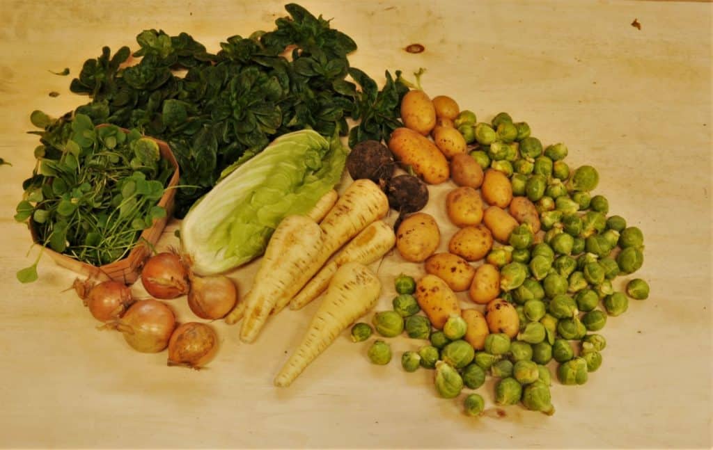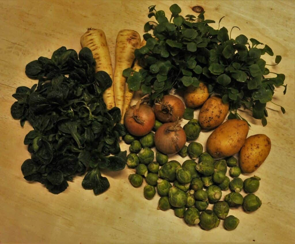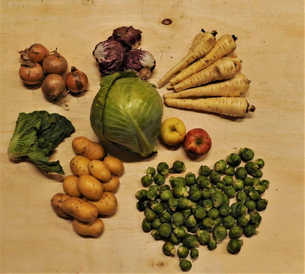 Kartoffeln (festkochend),  Rosenkohl, Zwiebeln, Posteleinsalat, Feldsalat, Pastinaken, ZuckerhutM-Kiste, Schwarzer RettichM-Kiste