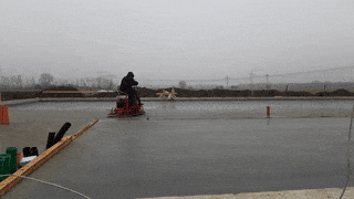 Auf dem Bau ist das Fundament fertig geworden. Diese außergewöhnliche Maschine schliff die Bodenplatte glatt, damit auch schwere Rollwägen voll Gemüse in der Packhalle mühelos umhergeschoben werden können.