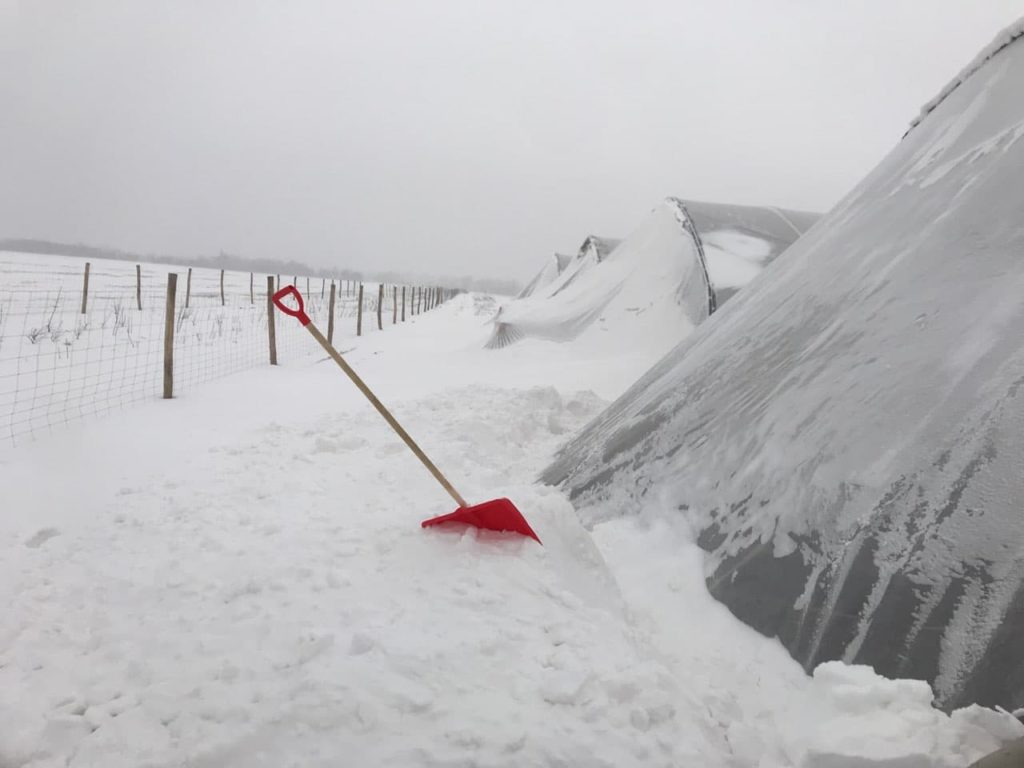 Man könnte ja meinen, GärtnerInnen hätten bei diesem Wetter mal frei! Aber wenn es dann so sehr zuschlägt, muss man aufpassen, dass die Folientunnel der Sache standhalten – und natürlich retten was zu retten ist: Die Wintersalate wurden am Sonntag noch schnell aus den Tunneln geerntet, bevor auch dort die Temperaturen ins Eisige rutschten. Danke an Johanna, Konrad, Jan-Felix & co. für den Einsatz.