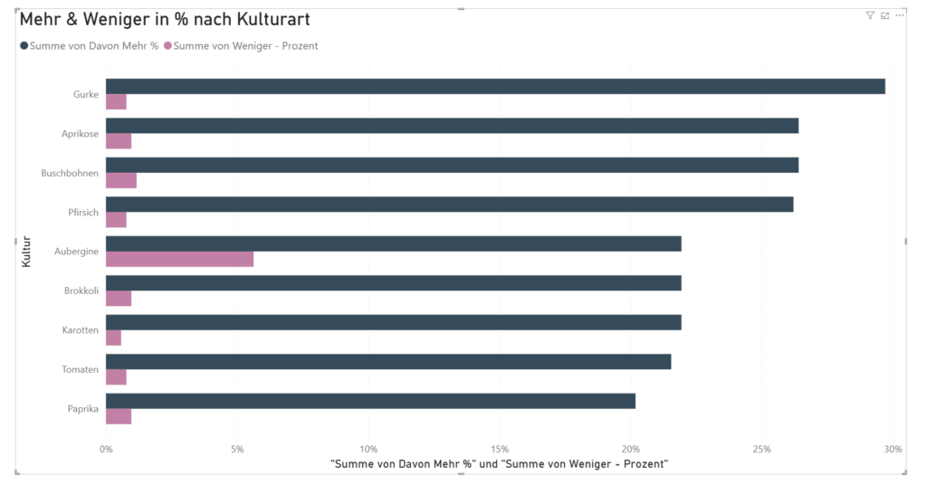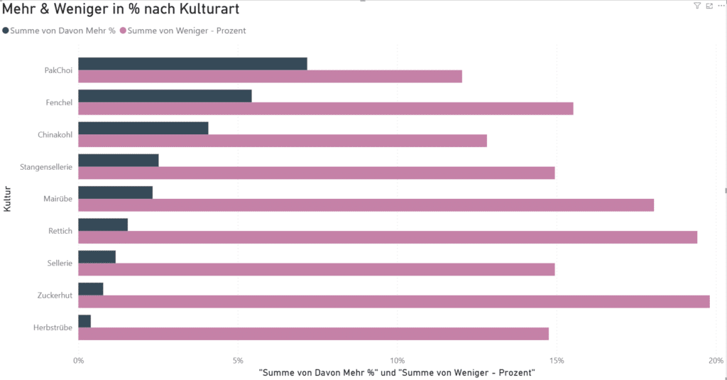 Nur noch kurz was zu den Kulturen wo die Meinungen am weitesten auseinander gehen. Rote Bete wollen 11 % mehr, 11 % wollen sie weniger: Ein Patt. Kopfsalat wollen 8 % weniger, 7 % mehr.