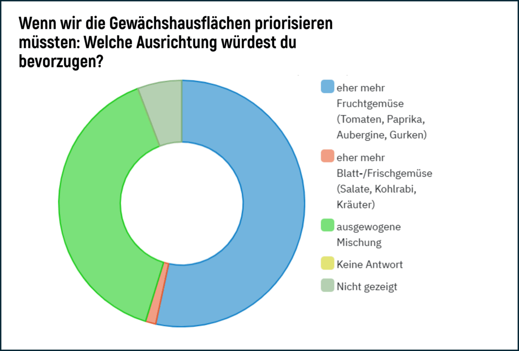 Natürlich spiegelt sich der Wunsch nach mehr Fruchtgemüse, auch in der folgenden Frage wider. 53 % bevorzugen eher mehr Fruchtgemüse. 39 % wünschen sich eine ausgewogene Mischung. Einsame 1,43 % bevorzugen eher mehr Blatt,- und Frischgemüse.